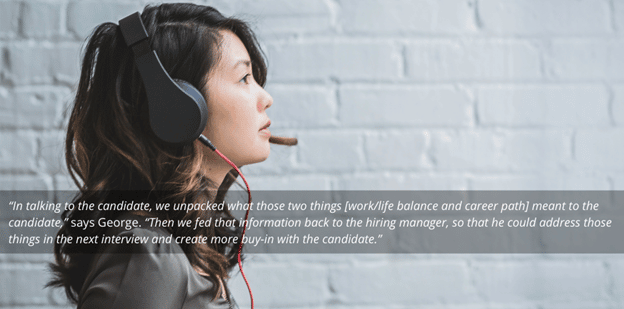 “In talking to the candidate, we unpacked what those two things meant to the candidate,” says George. “Then we fed that information back to the hiring manager, so that he could address those things in the next interview and create more buy-in with the candidate.”