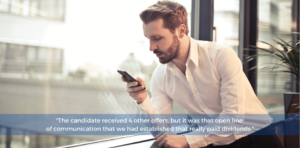 “We were talking on the phone, staying in touch, continuing to help build the rapport – not only between us, but between the client and candidate, too,” says Ryan. “That proved invaluable in the closing stages. The candidate received four other offers, but it was that open line of communication that we had established that really paid dividends.”