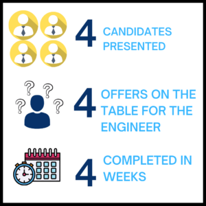 Within 4 weeks we had presented our best candidate and they were given an offer. This hire was particularly difficult because the candidate was a FAANG employee and in high demand by many other companies. They had 4 different offers to choose from.