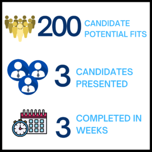 We reached out to around 200 individuals in our network, whittling the list down to around 20 or 30 who we held conversations with. We presented the top 3 candidates to the client.
